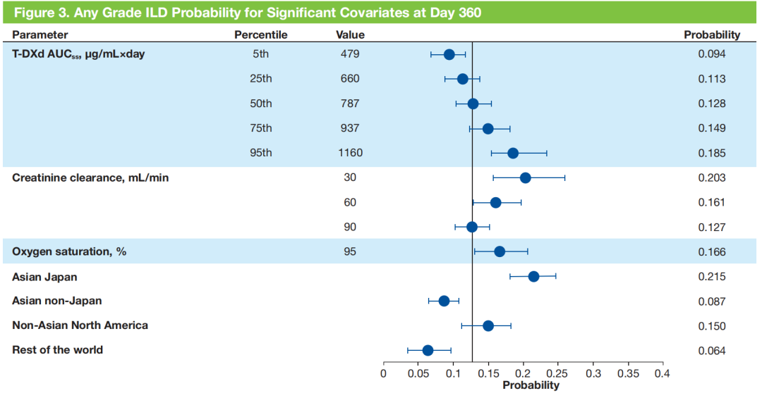 Claire Li等人在本次SABCS大会上进一步报道了DB-02和DB-03研究患者的暴露-疗效(Exposure-efficacy analysis)和暴露-安全(Exposure-safety analysis)分析[2]。E-S分析显示T-DXd暴露剂量增加与≥3级间质性肺病(ILD)事件显著相关(P<0.001),但总体上预计发生≥3级ILD事件的可能性均较低,仅在肌酐清除率下降、血氧饱和度降低等人群中发现更高的≥3级ILD发生可能性。这些药代动力学/药效学(PK/PD)研究表明,5.4 mg/kg Q3W T-DXd仍可作为标准剂量方案,其疗效和安全性与既往研究一致。