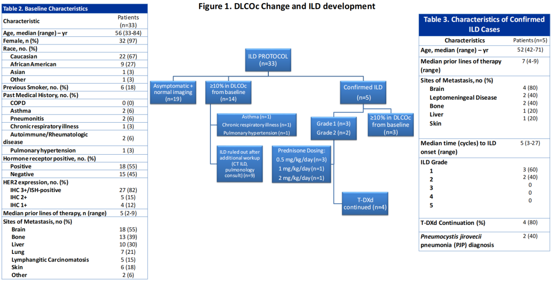 △杜克癌症研究所ILD/p监测研究:基线特征(左)、DLCO变化和ILD/p发展(中)、确诊ILD/p患者特征(右)