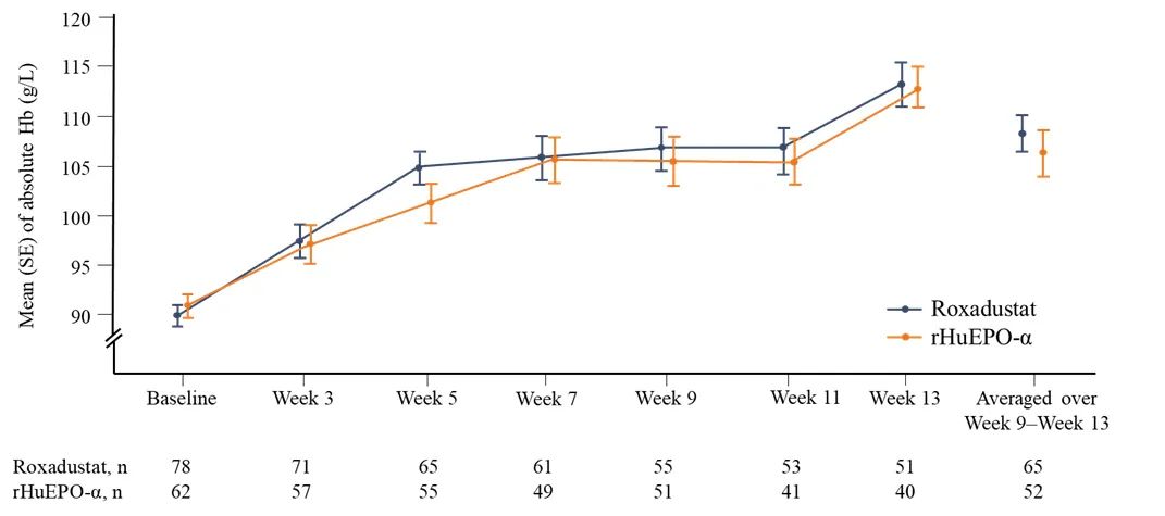 今年ESMO大会陆舜教授公布了接受化疗的非髓系恶性肿瘤患者使用罗沙司他治疗贫血的有效性和安全性的随机、开放、阳性对照、多中心III期研究结果[3],显示罗沙司他疗效上非劣于EPO(图2)。并且,罗沙司他治疗组中Hb水平升高≥10 g/L、≥15 g/L和≥20 g/L的患者比例均高于对照组;而且在FAS人群的罗沙司他治疗组中,观察到Hb首次升高15 g/L和20 g/L的中位时间在数值上更短(罗沙司他治疗组42.0和57.0天,rHuEPO-α治疗组52.0和77.0天)。而对于所有关键次要终点,罗沙司他疗效上非劣于EPO,探索性终点提示罗沙司他可降低输血负担,口服药依从性更优。从安全性方面而言,罗沙司他与SEPO安全性相当。