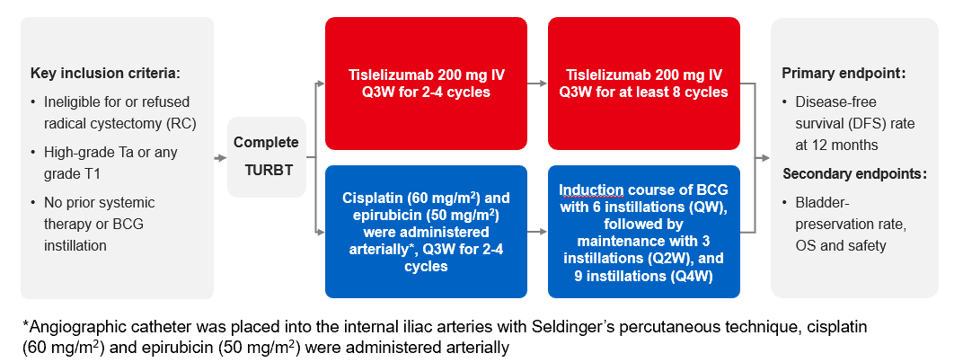 首先,通过经尿道膀胱肿瘤切除术(TURBT)切除膀胱内肿瘤病灶。其次,使用介入技术将血管造影导管置入髂内动脉,在第1天(D1)动脉给药顺铂(60 mg/m2)和表阿霉素(50 mg/m2),每3周给药,共2~4个周期。受试者在D1接受替雷利珠单抗200mg ivgtt,每3周一次,共2~4个周期。髂内动脉灌注治疗完成后,患者还将接受了18次BCG滴注和至少8个周期的替雷利珠单抗维持治疗(200 mg ivgtt,每3周一次)。