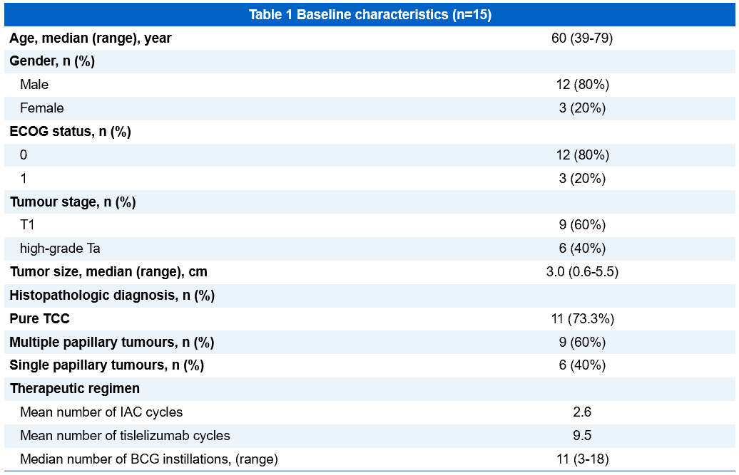 截至2023年12月,共有15名符合条件的患者入选。分析了15例患者(男性80.0%;中位年龄60岁(39~79岁);纯TCC 73.3%;中位肿瘤大小3.0 cm(0.6~5.5 cm);多发性乳头状肿瘤=60.0%;高级Ta=40.0%,T1=60.0%。