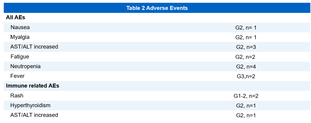 15名患者在治疗中出现的不良反应(AE)包括:恶心(n=1,G2)、肌痛(n=1、G2)、AST/ALT增加(n=3,G2),疲劳(n=3、G2),中性粒细胞减少症(n=4,G2)和发烧(n=2,G3)。免疫相关AE,包括皮疹(n=2,G1-2)、甲状腺功能亢进(n=1,G2)和AST/ALT增加(n=1、G2)。
