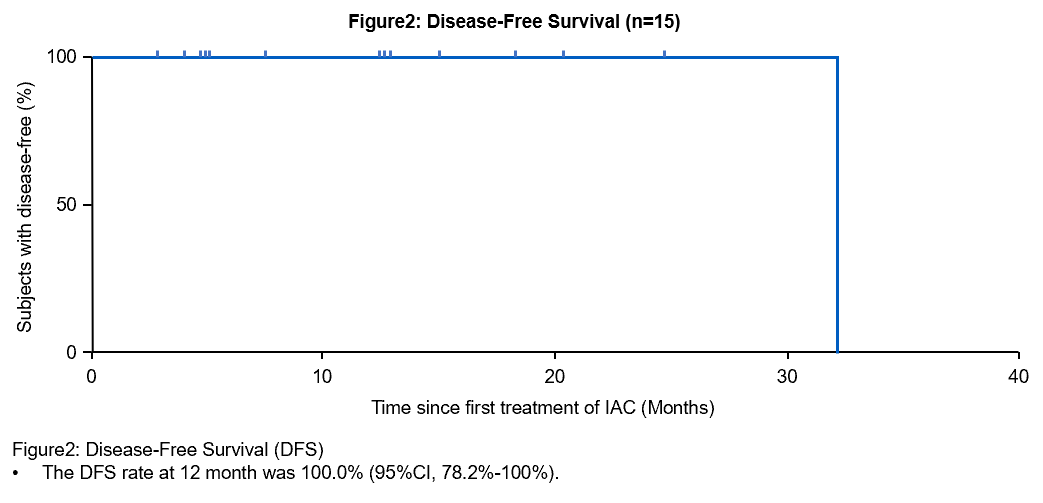 主要终点是研究者评估的1年DFS率(标准为:治疗后未出现高级别复发、T1复发或者疾病进展)。次要终点是保膀胱率、OS和安全性。统计终点:研究估计12个月时的DFS发生率不低于55%;该研究将纳入27名患者。
