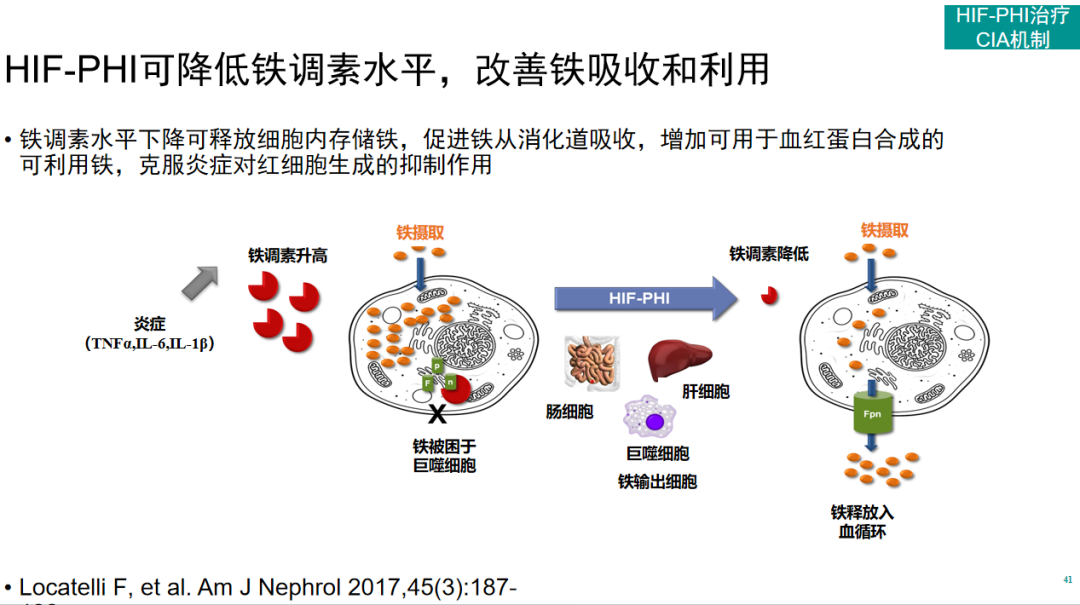 总之,HIF-PHI可以模拟低氧环境,进而稳定HIF,从而调控下游基因,上调EPO、EPO受体和铁调素相关基因和蛋白的表达,促进EPO生成和铁的利用,增加铁的利用,促进骨髓造血,进而改善炎性贫血[27,28]。