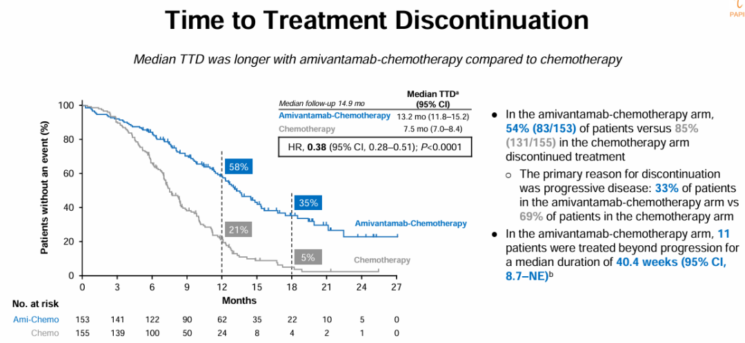 PAPILLON研究既往结果显示,EGFR-MET双特异性抗体Amivantamab+化疗(卡铂-培美曲塞)vs化疗一线治疗显著延长EGFR ex20ins突变晚期NSCLC的无进展生存(PFS),中位PFS为11.4个月vs 6.7个月(HR=0.395,P<0.0001),18个月PFS率为31%vs 3%。2024 ELCC展示的PAPILLON研究进展后结果显示,中位随访14.9个月时,联合治疗的中位至治疗终止时间(TTD)为13.2个月(95%CI:11.8-15.2),单独化疗为7.5个月(95%CI:7.0-8.4)(HR=0.38;95%CI:0.28-0.51;P<0.0001);在12个月和18个月时,Amivantamab+化疗组分别有58%和35%的患者仍在接受治疗,而单独化疗组的对应数据仅为21%和5%。联合治疗组的中位至后续治疗时间(TTST)为17.7个月(95%CI:13.7-不可评价[NE]),单独化疗组为9.9个月(95%CI:8.6-11.1)(HR=0.35;95%CI:0.25-0.49;P<0.0001)。在12个月和18个月时,联合治疗组分别有68%和49%的患者未接受后续治疗,而单独化疗组分别有36%和14%的患者未接受后续治疗。