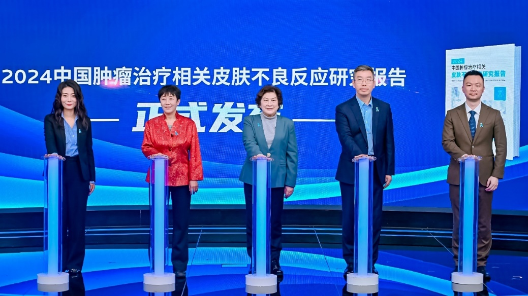 《2024中国肿瘤治疗相关皮肤不良反应研究报告》发布仪式(自左至右):欧莱雅皮肤科学美容事业部孟颖琪女士、北京大学公共卫生学院刘民教授、北京爱谱癌症患者关爱基金会史安利理事长、中日友好医院崔勇教授、欧莱雅皮肤科学美容事业部郑一诫博士。