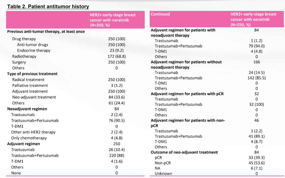 截至2023年9月21日,250例患者被纳入分析。患者的中位年龄50.0岁,绝经后患者有161例(64.4%)。初诊时,57.2%的乳腺癌患者为HR+/HER2+;cT1期患者占24.4%,cT2期患者占57.2%;73.6%的患者为N+,88.4%的患者为Ⅱ~Ⅲ期HER2阳性乳腺癌。84例(33.6%)患者接受了新辅助治疗,46例患者未达到pCR。无论患者是否达到pCR,曲妥珠单抗联合帕妥珠单抗是最常用的新辅助治疗方案。共有250例患者(100%)接受了辅助治疗,其中220例(88%)患者接受了曲妥珠单抗联合帕妥珠单抗治疗,26例(10.4%)患者仅接受曲妥珠单抗治疗。