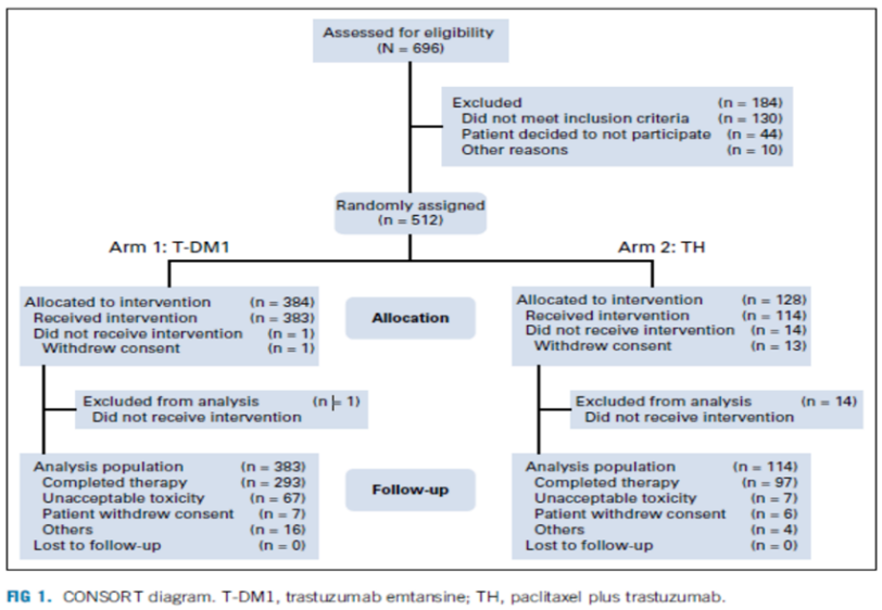 2013年5月17日至2016年12月13日,共招募512例参与者。T-DM1组中的383例患者纳入分析。TH组中的114例患者被纳入分析(图1)。