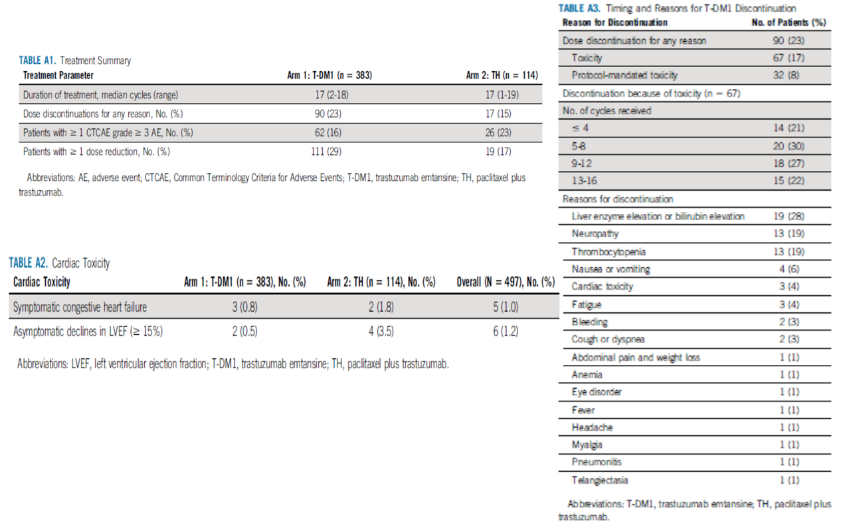 研究者纳入美国24家中心的年龄≥18岁、东部肿瘤协作组体能状态评分(ECOG)≤1、左心室射血分数(LVEF)≥50%、、最近一次乳房手术后90天内、、既往无乳腺癌病史、淋巴结阴性(N0)或≤1淋巴结微转移(N1mi)HER2阳性Ⅰ期侵袭性乳腺癌患者。在基线、3个月、6个月、9个月和1年时,用超声心动图或多次采集扫描评估LVEF。如满足以下任一条件,则需中断曲妥珠单抗或T-DM1:LVEF较基线下降10-15个百分点且低于正常下限至少1个百分点,或较基线下降≥16个百分点。