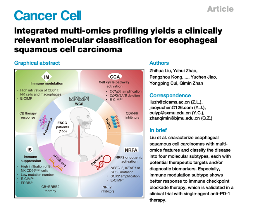 北京大学詹启敏、中国医学科学院刘芝华和焦宇辰、深圳湾实验室崔永萍合作团队针对155个ESCC患者样本进行全基因组、转录组、甲基化和蛋白质组进行测序,从多组学角度确定了四种ESCC分子类型:细胞周期通路激活型(CCA)、NRF2通路激活型(NRFA)、免疫抑制型(IS)和免疫调节型(IM)。该研究基于多组学整合分析分析,首次将食管鳞癌分为四种类型。制定了食管鳞癌分子分型分类标准,发现了更多食管鳞癌患者的特异靶点,为后续开展针对食管鳞癌的药物研发、临床试验提供数据和证据的支持。因此被评为“重要研究”。