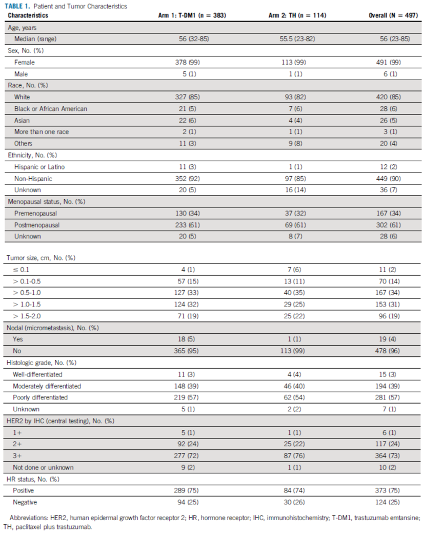 研究者纳入美国24家中心的年龄≥18岁、东部肿瘤协作组体能状态评分(ECOG)≤1、左心室射血分数(LVEF)≥50%、、最近一次乳房手术后90天内、、既往无乳腺癌病史、淋巴结阴性(N0)或≤1淋巴结微转移(N1mi)HER2阳性Ⅰ期侵袭性乳腺癌患者。在基线、3个月、6个月、9个月和1年时,用超声心动图或多次采集扫描评估LVEF。如满足以下任一条件,则需中断曲妥珠单抗或T-DM1:LVEF较基线下降10-15个百分点且低于正常下限至少1个百分点,或较基线下降≥16个百分点。