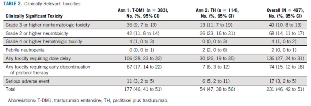 共同的主要终点是患者的iDFS,并比较T-DM1 vs TH的CRT发生率。关键次要终点包括使用FACT-B生活质量,使用RSCL和PNQ比较两组之间的症状,使用WPAI:SHP评估对工作效率和活动的影响,以及使用脱发问卷评估脱发的影响。