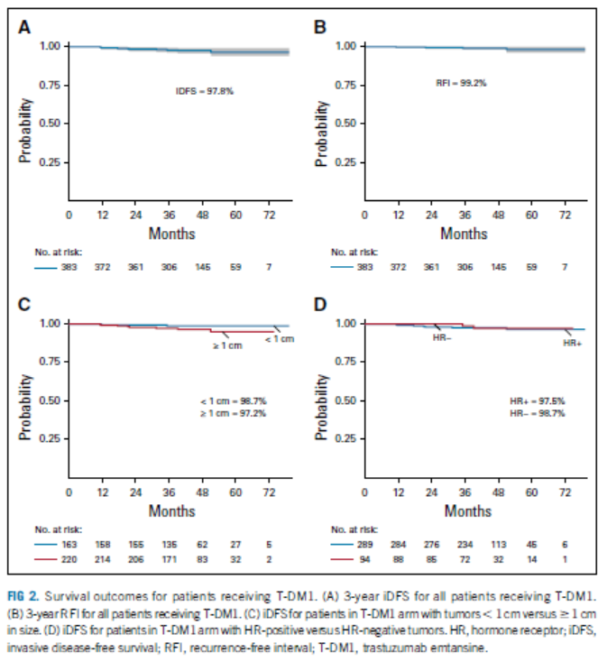 T-DM1组共10例患者发生侵袭性疾病事件或死亡:2例远端复发,2例局部或区域复发,3例为对侧原发性乳腺癌(HER2阴性),3例为研究治疗无关的非乳腺癌相关死亡。T-DM1组的三年iDFS率为97.8%(图5A),超过了方案预设的95%。3年RFI为99.2%(95%CI,98.2-100;图5B,图6-A4)。肿瘤大小为<1cm和≥1cm的患者、HR阳性和HR阴性患者的生存结果相似(图5C、图5D)。