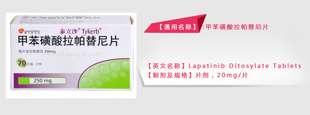 【药物毒理】:甲苯磺酸拉帕替尼片是小分子4-苯胺基噻唑类受体酪氨酸激酶抑制剂,抑制表皮生长因子受体(ErbB1)和人表皮因子受体2(ErbB2)。4种乳腺癌细胞株中BT474和SKBr3对拉帕替尼敏感,半抑制浓度为25和32nmol/L,MDA-MB-468和T47D细胞株不敏感,半抑制浓度在微摩尔级别,对于膀胱癌的2种细胞株,RT112(ErbB1和ErbB2高度表达)和J82(ErbB1和ErbB2低度表达),增强顺铂的疗效。在多种动物均能抑制表皮因子驱动的肿瘤生长,拉帕替尼对曲妥珠单抗耐药的肿瘤细胞株有效。